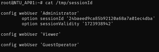 We can also verify that we obtained a valid admin session token by checking the /tmp/sessionId file on the router: